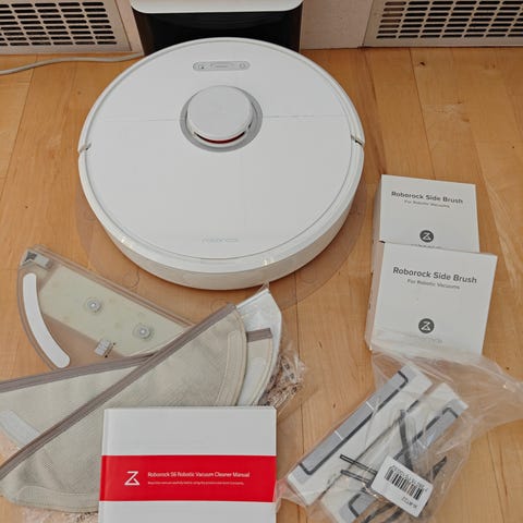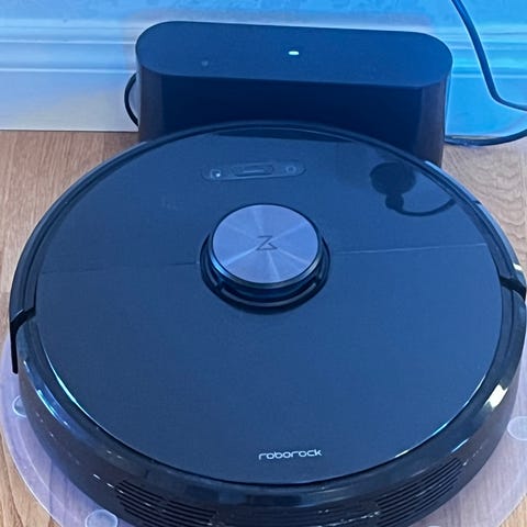 Roborock robotdammsugare i svart utförande. Enheten har rund design med toppmonterad lasersensor och medföljande laddstation med nätkabel. Passar för automatisk dammsugning av hårda golv och mattor i hemmet. Modellbeteckning och exakta tekniska specifikationer framgår inte av uppgifterna och kan kontrolleras på enhetens undersida eller i manual om tillgänglig.