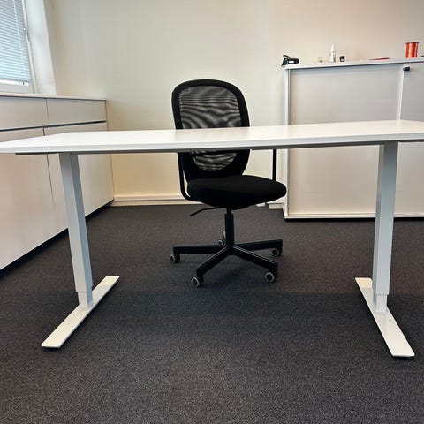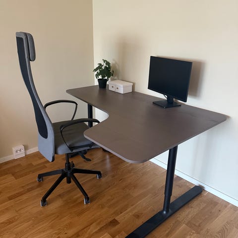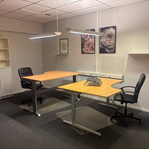 Kinnarps skrivbord med höj- och sänkbart stativ. Bordsskiva i bokfanér och svart metallstativ. Skrivbordet har en svängd/ergonomisk form som ger god arbetsyta och plats för stol i mitten av kurvan. Elstyrning med kontrollpanel under bordsskivan för justering av höjd. Även kontorsstol Kinnarps. Sidobord, hurts och dokumentskåp IKEA.