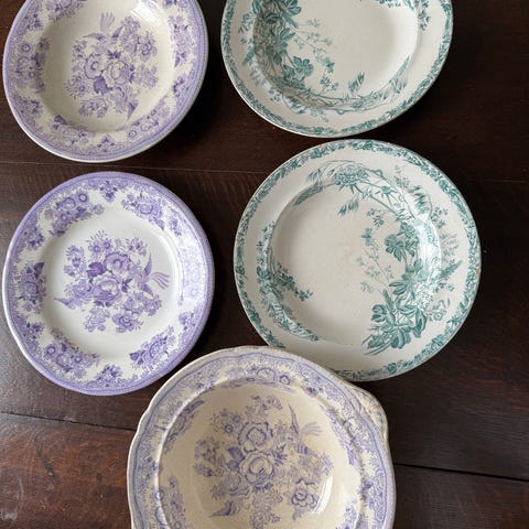 18 tallrikar i olika storlekar plus 12 assietter Gustavsberg troligen 30-tal