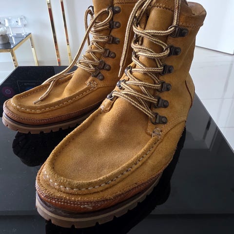 Timberland vinterkängor i storlek 45. Höga kängor i brun färg med snörning och vadderad, mönstrad insida runt skaftet. Grov sula anpassad för vinterbruk. Passar som varma och stabila vinterskor för herr i kallare väder.
