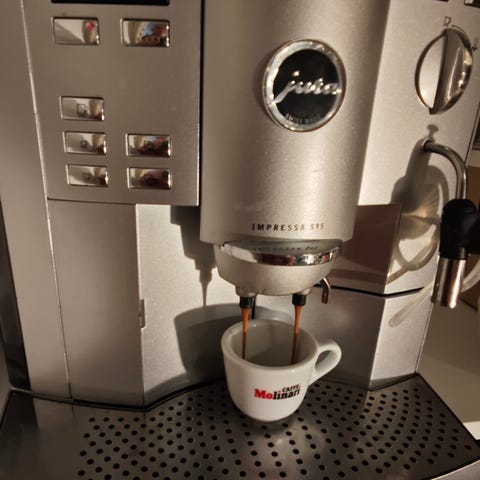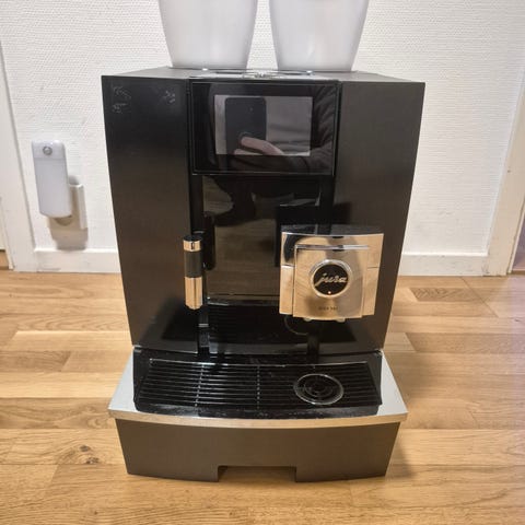 Allt fungerar och maskinen är nu noggrant rengjord och redo att byta ägare. Funktioner: Espresso och kaffe med enkel- och dubbelkoppsfunktion, Latte Macchiato, Cappuccino och tevatten. Priset är prutat och klart!