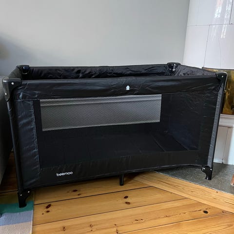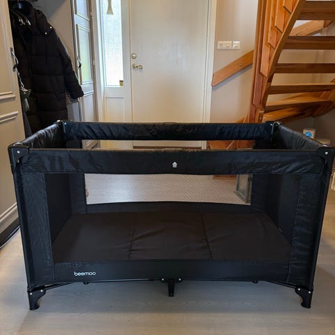 Beemoo resesäng i svart färg. Sängen är hopfällbar och levereras i bärväska för enkel transport och förvaring. Passar som extrasäng eller sovplats för barn vid resor och övernattningar. Sidopanel med nät ger insyn och ventilation. Sängen är avsedd för småbarn enligt tillverkarens rekommendationer.
