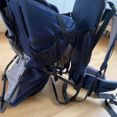 Bärstol i form av ryggsäck för att bära barn. Modellen har ramkonstruktion som kan ställas ned på marken, vadderade axelremmar och midjebälte för den som bär samt sits med ryggstöd för barnet. Flera remmar och spännen håller barnet på plats. Ryggsäcken har förvaringsfack och sidofickor. Färg i huvudsak grå med mörka detaljer, av textilmaterial med metallram. Lämplig för att bära ett barn vid promenader eller utflykter.
