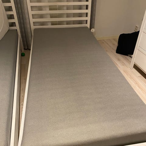 IKEA säng (inkl. sängben) med bäddmadrass i vit färg. Sängen har ribbotten i trä och en tjock resår- eller skummadrass med tygklädsel. Till sängen hör även en vit bäddmadrass med knappstoppning. Passar som vanlig säng i sovrum eller gästrum.