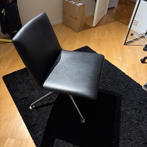 Stolen har hög rygg och sits klädd i slätt, svart konstläder. Ben och underrede är i metall. Passar som matstol eller extra sittplats i exempelvis kök, vardagsrum eller kontor.