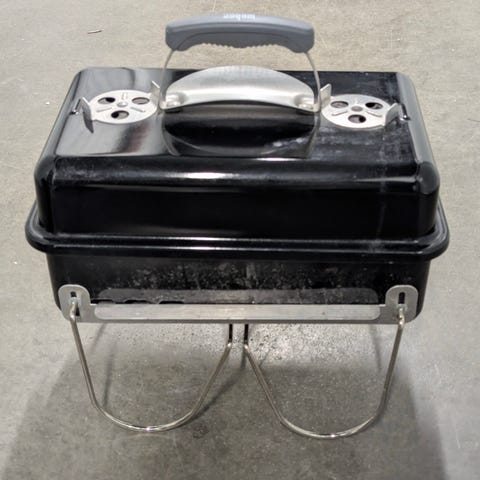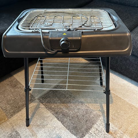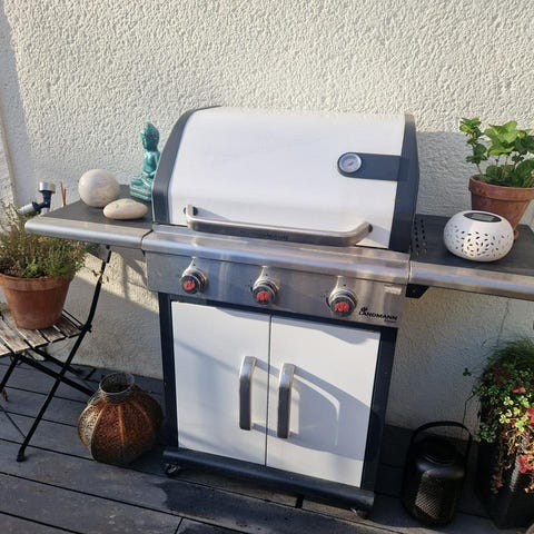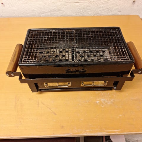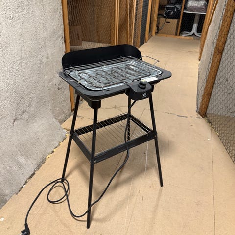 En använd grill en ny i förpackning där saknas dock grillgallret. Två tomma gasol tuber. En Primus gasol lykta med tillbehör.