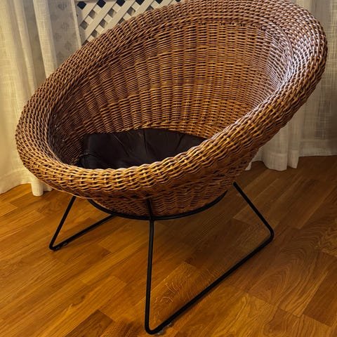 Säljer en loungestol i skandinavisk design. Köpt på Walles & Walles, Birgerjarlsgatan 81 i Stockholm. Handvävd rotting och gediget ekram med smidigt formade armstöd och fina konturer. Passar lika bra i vardagsrummet som på kontoret.