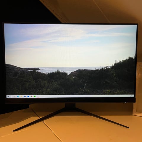 Acer datorskärm med 24 tum skärmstorlek i svart utförande. Skärmen är monterad på en rund fot med höjdjusterbart stativ. Passar för användning med stationär dator för både spel och arbete med sina 144".