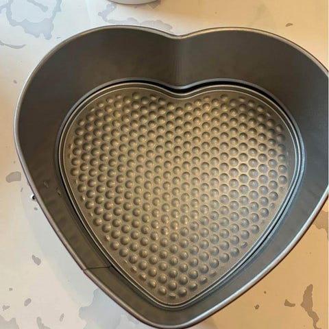 IKEA hjärtformad bakform i röd metall. Formen har en klassisk hjärtform med slät insida och löstagbar botten. Passar för bakning av kakor, tårtor och desserter. Storleken framgår av bilden med måttband för ungefärlig höjd/längd på formen.