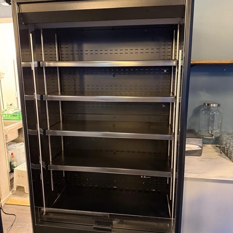 Dubbelkyl display med skjutbara glasdörrar i svart utförande. Invändigt finns flera justerbara trådhyllor i metall och ett kylaggregat med dubbla fläktar i ovankant för jämn luftcirkulation. Utsidan har strömbrytare och kontrollpanel upptill på fronten. Skåpet är avsett för förvaring och exponering av kylda varor i exempelvis butik, café eller förråd.