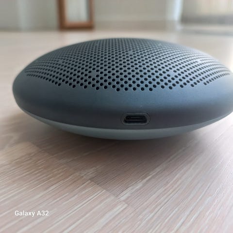 Google Home smart högtalare i vit färg. Modellen är en röststyrd högtalare avsedd för användning i hemmet. Enheten ansluts till eluttag med medföljande nätadapter och används tillsammans med wifi och kompatibla tjänster för att spela upp ljud, styra uppkopplade enheter och ge röstbaserad information. Högtalaren har integrerade mikrofoner på ovansidan och tygklädd nederdel. Passar för placering på bord, hylla eller bänk i till exempel vardagsrum, kök eller sovrum.