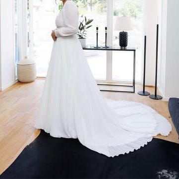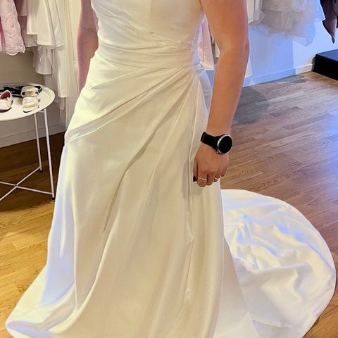 Fantastiskt fin bröllopsklänning i US14 / storlek 42. Klänningen är axelbandslös med figurnära liv och markerad midja. Kjolen är hellång med oerhört fint släp med rynkade partier som ger struktur och form.
