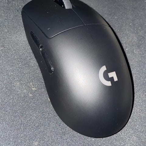 Logitech G Pro trådlös datormus i svart färg. Musen är utformad för användning med dator och ansluts trådlöst via den medföljande USB-mottagaren. Den har scrollhjul, sidoknappar och en kompakt, symmetrisk form som passar både höger- och vänsterhänta användare. Passar för allmän datoranvändning och spel.