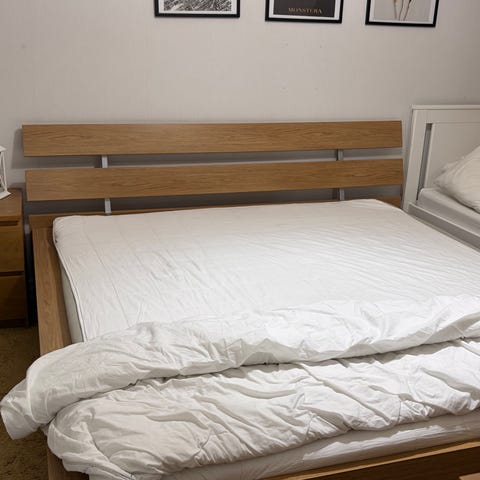 Dubbelsäng i trä med äldre resårmadrasser bortskänkes