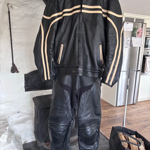 Lindstrands motorcykelställ bestående av motorcykeljacka och motorcykelbyxa i svart textil med kontrastpaneler. Stl XL På bilderna syns även tre svarta integral- och öppna motorcykelhjälmar, stl L 60 ett par svarta motorcykelhandskar med regnskydd samt ett rryggskydd stövlar .Flera plagg och skydd har logotyper och reflexdetaljer som kan ge bättre synlighet i trafiken. Rengnskyddsöverdrag Finns i Kungshamn. Det är bara Motorcykeln som fattas.