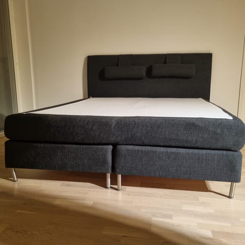 KungSängen kontinentalsäng i grått tyg. Består av två underdelar som tillsammans bildar en dubbelsäng. Sängen har raka, vita ben med grå nederdel. Överdel med slät bäddyta enligt bilder. Lämplig som stadig dubbelsäng i sovrum. Exakta mått och hårdhetsgrad framgår inte av underlaget.