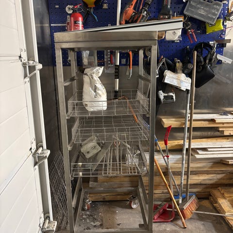 En stabil arbetsbänk som klarar ett par hundra kilo. Kan även fälla ner en järnsektion som sitter med dämpare som måste fällas mot ett stop.
