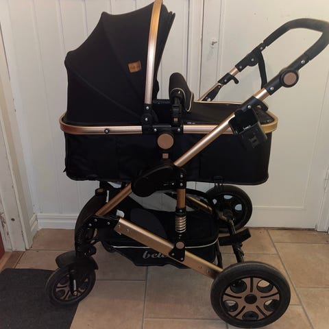 Britax barnvagn i blått tyg med svart chassi. Vagnen har justerbart ryggstöd, fempunktssele och avtagbar bygel framtill. Handtag och frontbygel är klädda i material med läderlook. Under vagnen finns en varukorg för förvaring. Passar ett barn och är utformad för vardagsbruk, promenader och resor i stadsmiljö.