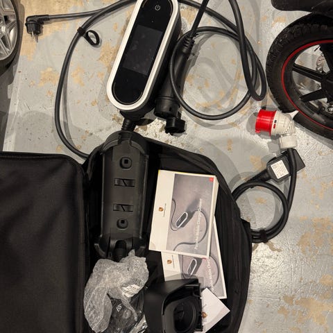 Porsche laddbox för elbil med integrerad laddkabel. Enheten har kontrollenhet med indikatorlampor och anslutningskabel med röd trefas-kontakt. Passar för laddning av elbil eller laddhybrid från Porsche där denna typ av laddutrustning används. Levereras med kablage enligt bild. Porsche Cayenne (9Y0 9Y3) Battery charger (optional) 9Y0971675AK