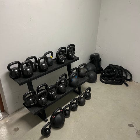 Helt nytt kettlebell rack från Eleiko. Har stått kettlebells på, men eftersom dessa inte använts har racket stått helt orört sedan inköp. Gummitäckta hyllor skyddar utrustningen och minskar oljud.