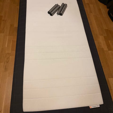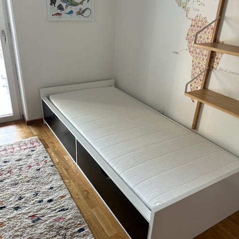 IKEA säng med madrass i enkelstorlek. Sängen har vit sängram med enkel huvudgavel. Passar som enkelsäng i sovrum, gästrum eller studentboende. Madrass och sängram ingår enligt bild.