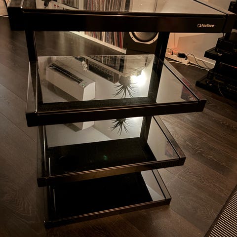 Klarlackerad bokfanerad träfiberskiva. Ben av lackerad stålrör på hjul. 2 hjul är låsbara.