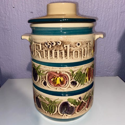 Retro pajform och lock med reliefdekor i glaserad keramik.