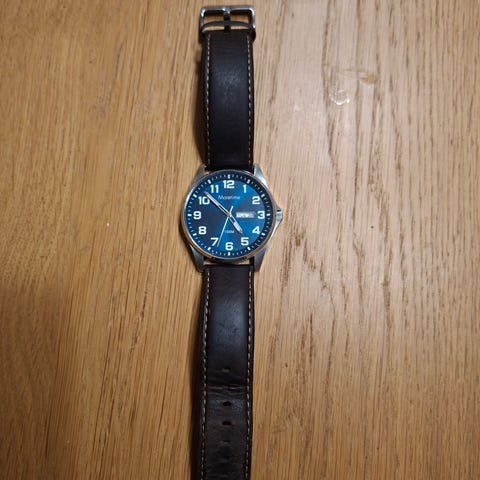Helt ny, svart urtavla dold krona i muttern,som måste skruvas upp och sen ställa in tiden. Fint skick ny