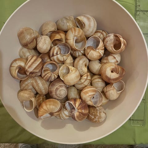 Snäckskal i gott skick med underlägg, passar för förrätter och dylikt.