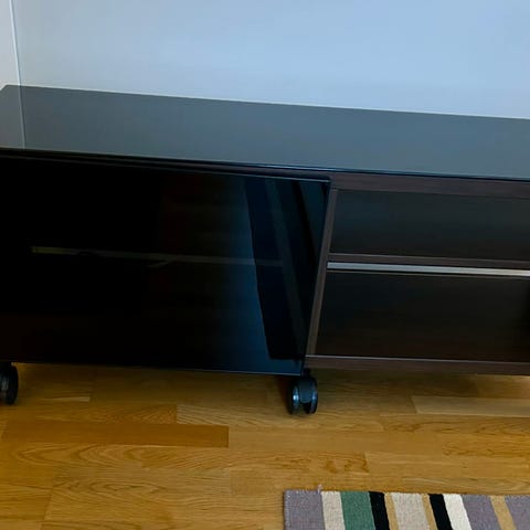 Tv-bänk i svart utförande med glasdörr framtill. Möbeln har en öppen hylla bakom glasdörren, en utdragbar låda samt ett skåp med dörr och inbyggd trådkorg för extra förvaring. Tv-bänken står på hjul vilket underlättar förflyttning och kabeldragning. Passar för tv och medieutrustning i vardagsrum eller tv-rum.
