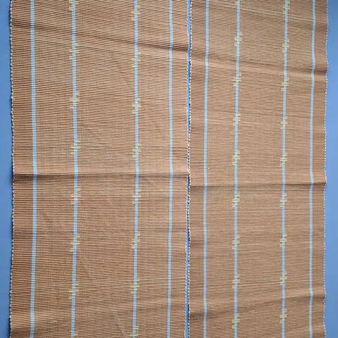 Löpare i textil med mönstrade ränder i flera färger. Passar som bordsdekoration på matbord, sideboard eller andra ytor. Materialet är hemvävt tyg med återkommande geometriskt mönster och horisontella ränder i olika färger.