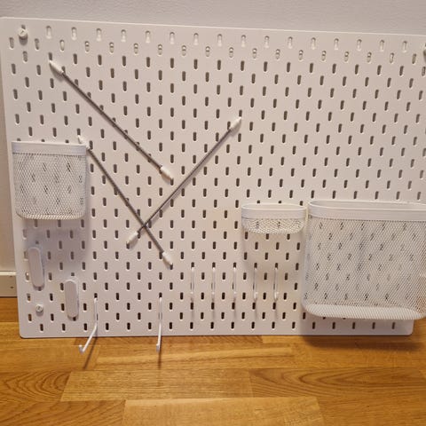 Metallnät från Clas Ohlsson. 50x70 cm med hållare för tidningar/post, några klämmor, krokar och en hylla.