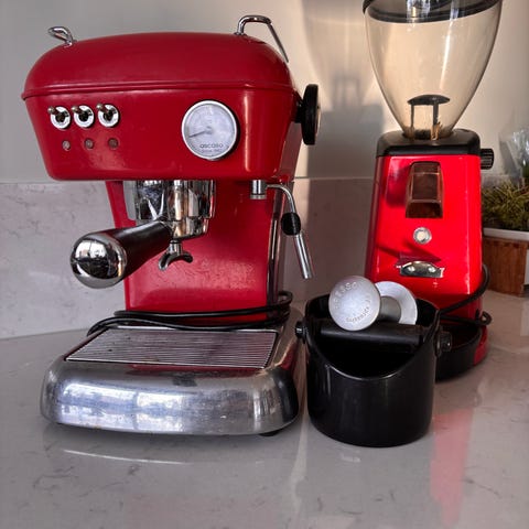 La Spaciale mini vivaldi II espressomaskin för bryggning av espresso och kaffedrycker. Maskinen har portafilter, koppställ ovanpå och droppbricka. Passar för användning i hemmet eller mindre serveringsmiljöer där man vill kunna göra espresso, cappuccino och liknande drycker. Maskinen används tillsammans med separat kaffekvarn (ingår)och tillbehör som tamper och mjölkkanna, som på bilden står bredvid maskinen.