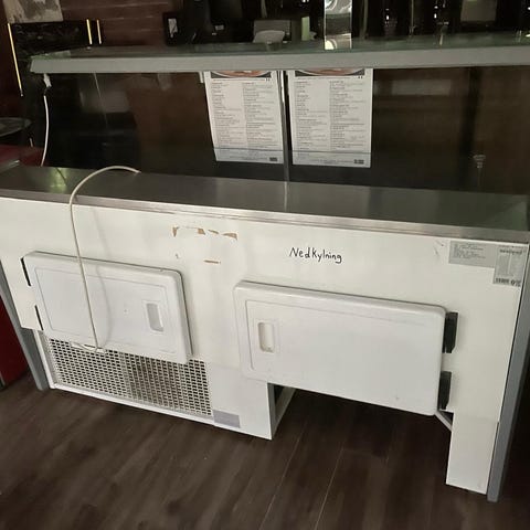 Kema kylbänk med glasdisk i rostfritt stål. Utrustad med flera kylskåpsdörrar undertill och glasad överdel för exponering av matvaror. Integrerad kylmodul med digital temperaturvisning och reglage på fronten. Passar för restaurang, café eller delikatessdisk där kyld förvaring och samtidig exponering av livsmedel behövs.