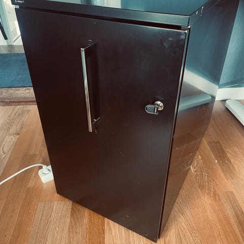 Soptunna/förvaring designad som en konservburk. Svart pulverlack. Pivothjul.