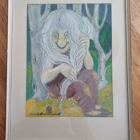 Oljemålning med motiv av en bukett vilda blommor i en vas. Tavlan är signerad och daterad 1984 i nedre hörnet. Målningen är inramad i en profilerad träram. Färgskalan går i dova, naturliga toner med inslag av blått, vitt, gult och rosa. Lämplig som väggdekoration i exempelvis vardagsrum, hall eller sovrum.