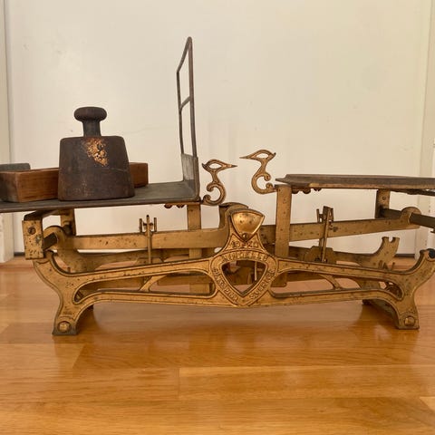 Mekanisk golvvåg i trä och metall. Vågen har en stabil träram med metallförstärkningar och vikter.Avsedd för vägning av tyngre föremål, exempelvis i verkstad, förråd eller lantbruk. Konstruktionen är helt manuell med hävarm och mekaniskt vågsystem. Passar för den som behöver en robust industrivåg eller som är intresserad av äldre mekanisk utrustning.