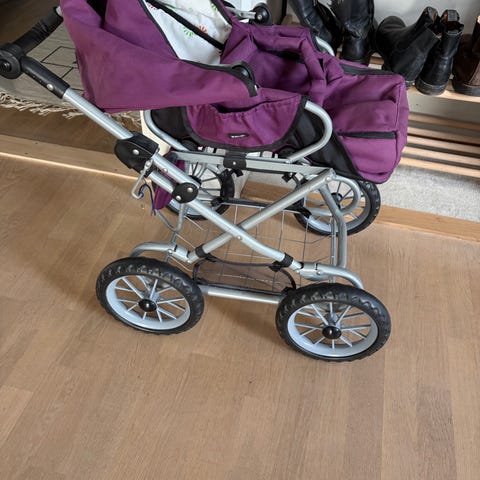 BRIO dockvagn i rosa tyg med metallchassi. Vagnen har fyra hjul, justerbart handtag och varukorg under sitsen.