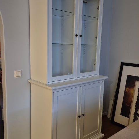 Säljer vårat vitrinskåp då det inte får plats i nya lägenheten! Är osäker på om det är från ikea då det var ett tag sen vi köpte de.. På höjden är det 180cm och bredden 90cm.