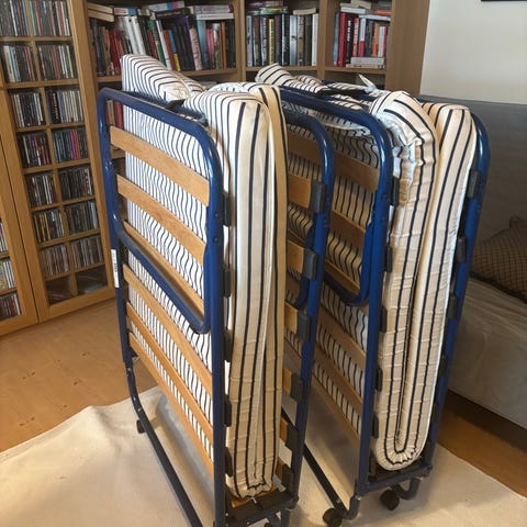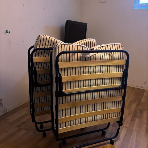 Två IKEA gästsängar / extrasängar med madrasser, i utmärkt skick, något enstaka spår efter användning. Blå metallram med ribbotten, madrass med randigt överdrag. Sängarna har hjul och kan fällas ihop. Lämplig som extrasäng i hemmet eller för gästrum.