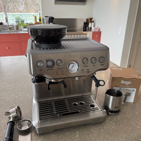 KitchenAid 5KES6403EDG espressomaskin i grå färg. Maskinen är avsedd för att brygga espresso och har ångstav för skumning av mjölk. På bilderna syns portafilter, flera filterkorgar, tamper och mjölkkanna i metall. Passar för hemmabruk på köksbänk och kan användas för att göra espresso, cappuccino och liknande kaffedrycker.