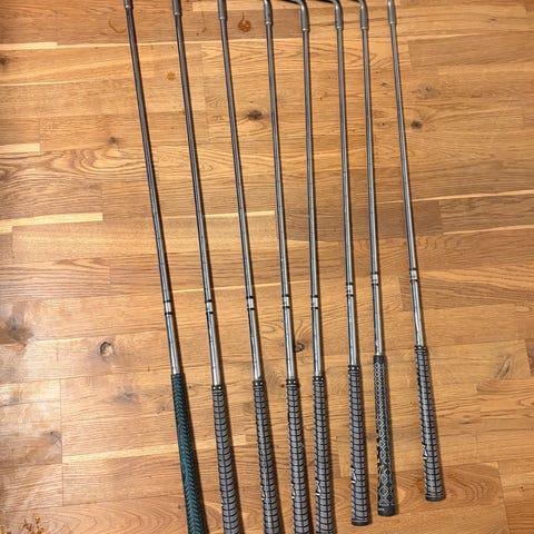 Järnset med flera golfklubbor av samma modell. Klubborna har metallskaft och huvuden i metall, lämpliga för spel på golfbana. Passar golfare som söker ett komplett set med järnklubbor. Exakt märke, modell, flex och loft framgår inte av informationen och bör kontrolleras vid intresse. Set includes 4, 5, 6, 7, 8, 9, P and S