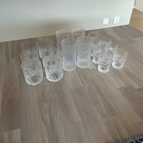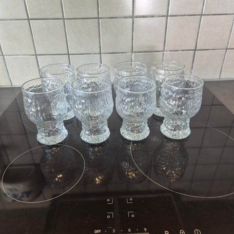 12 st Iittala glas i frostat glas. Modell Aslak. Glasen har en strukturerad, isliknande yta och fyrkantig fot. Passar för servering av vatten, juice eller andra kalla drycker i kök och matsal. Säljs som set enligt bilderna.