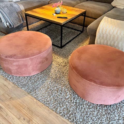 Två stycken sittpuffar från Mios möbler i sammet. Färgen är gammelrosa. Det finns några små fläckar på den ena sittpuffen (se bild).
