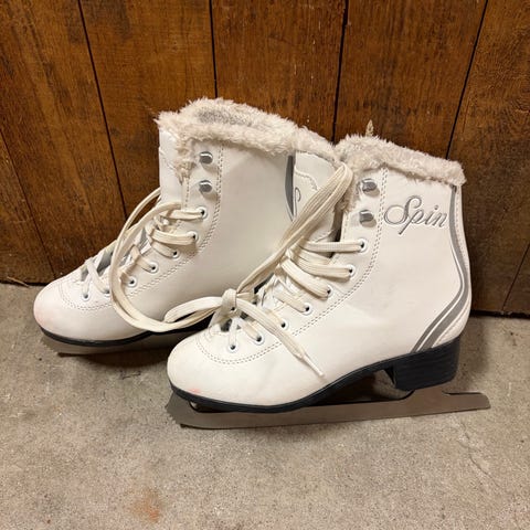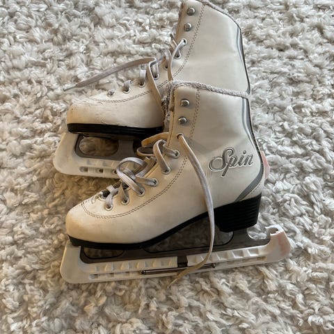 Revolution Spin SR skridskor i storlek 36. Modellen har vit ovandel med snörning och syntetpälsfoder för extra värme och komfort. Längden på innersulan är cirka 24,1 cm enligt märkning. Skridskorna är utrustade med klassiska skenor för allmän åkning på is, lämpliga för barn eller ungdom med skostorlek 36.