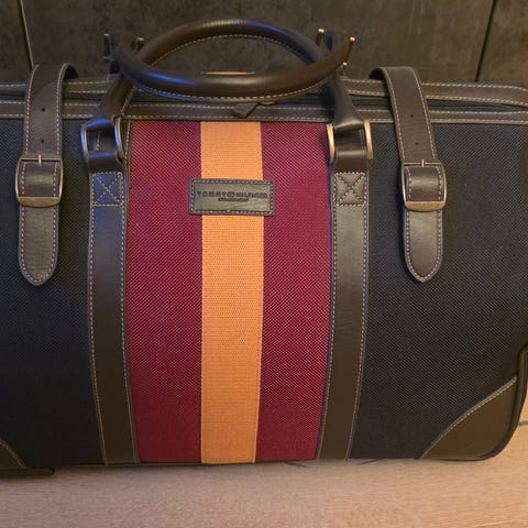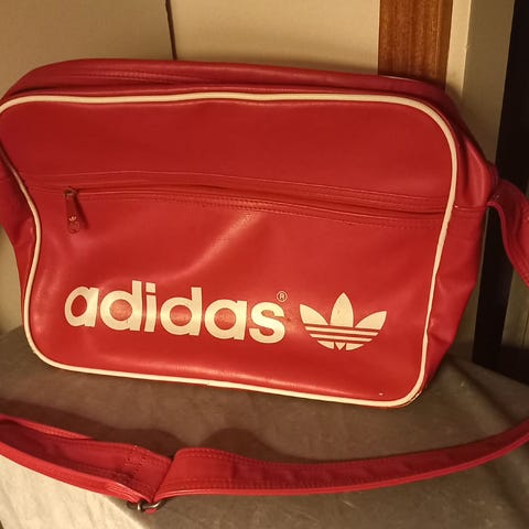 Retro Adidas väska i fuskläder för unisex. Sparsamt använd men i mycket gott skick. Väskan är blå med röda ränder och Adidas-logga. Utrustad med dubbla handtag. Rymligt huvudfack med dragkedja och textilfodrad insida. Väskan har förstärkt botten med metallfötter. Lämplig som sportväska, weekendbag eller reseväska.