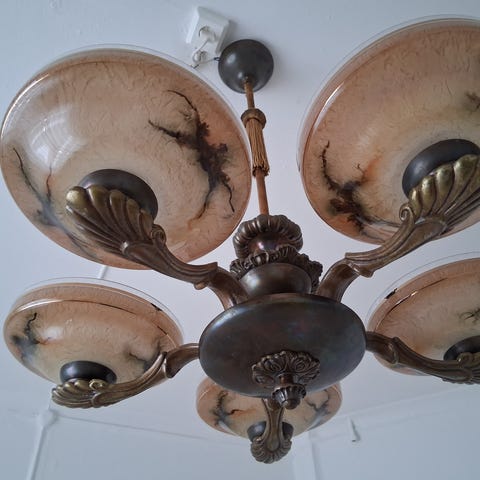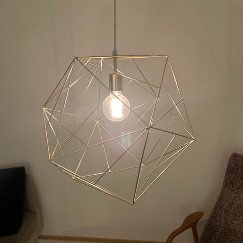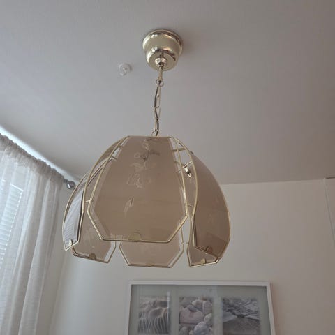 Taklampa med fem armar i mässingsfärgad metall och skärmar i strukturerat glas. Lampan är avsedd för montering i tak och har plats för fem ljuskällor. Passar exempelvis i vardagsrum, matsal eller hall där man önskar jämn allmänbelysning.