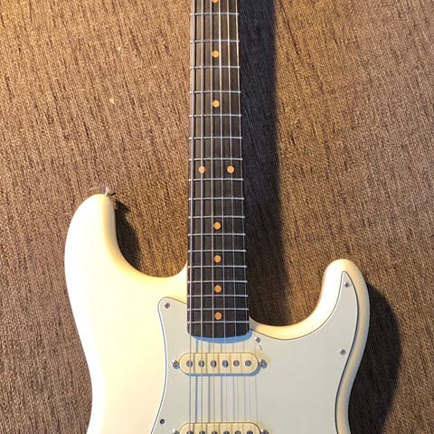 Mycket gott skick, 8/10, en av de allra första relikerna gjorda av Vince Cunetto i hans verkstad, lönnhals med svarta prickar och ett vitt enskikts-skydd, har Custom Shop-präglat stämpel på baksidan av headstocken, guldbeslag, flammad lönn i nacken, stämplad halshäl S.