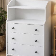 Vit byrå med tre lådor och öppen hylla upptill. Passar för förvaring av kläder, böcker eller andra mindre saker i till exempel sovrum eller vardagsrum. Lådorna har knoppar framtill och byrån står på låg sockel mot golvet. Ytan är slät och lätt att torka av.
