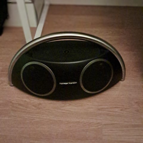 Snygg högtalare med bra ljud som säljs då den sällan används. Batteriet håller tyvärr bara några minuter. Man får ha strömadaptern inkopplad eller byta batteri om man behöver den utan vägguttag.